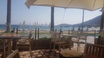Travelers relax under beach umbrellas on the sandy shore or savor fresh cuisine at the restaurants - a perfect coastal retreat for sun-seekers.