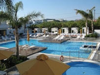 Travelers can sip refreshing cocktails by the pool and savor international cuisine at this relaxing retreat in the heart of Faliraki