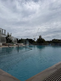 An outdoor pool and a hot tub are on site. Other recreational amenities include a sauna and a fitness center.