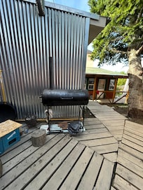 Safety features at this property include a carbon monoxide detector, a fire extinguisher, a smoke detector, a security system, and a first aid kit