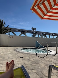 Travelers enjoy the sunny poolside oasis at this Ventura hotel, where the spa tub offers a perfect spot to rejuvenate after exploring the area