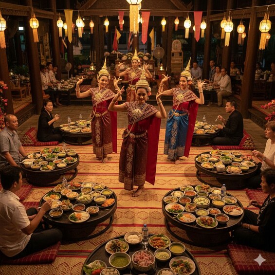 El Thai Khantoke Dinner & Cultural Dance Show with Transfers ofrece una velada encantadora llena de auténtica cocina tailandesa y espectáculos culturales tradicionales, proporcionando una experiencia inmersiva en el rico patrimonio de Tailandia. Este delicioso evento es perfecto para aquellos que buscan explorar la cultura local mientras disfrutan de una experiencia gastronómica única. Esto es lo que puede esperar: